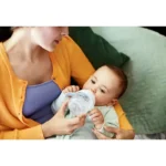 Naturalra al vaso. Con los mangos suaves al tacto, el bebé podrá sujetar la mamadera de manera independiente mientras bebe de la tetina familiar.
