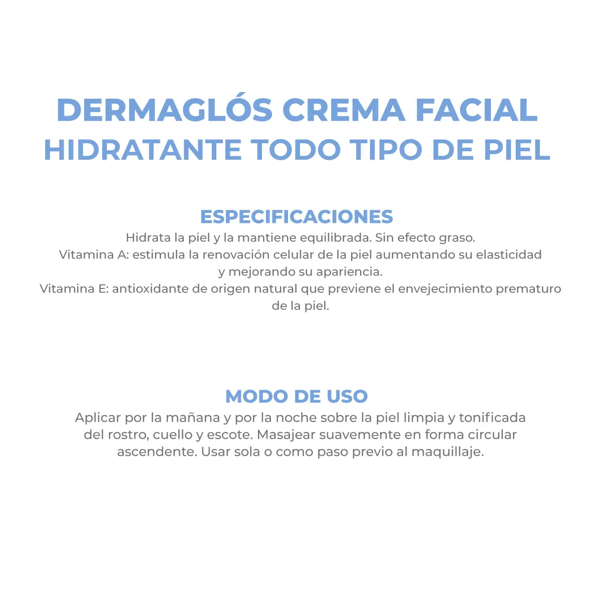 Aplicar por la mañana y por la noche sobre la piel limpia y tonificada del rostro, cuello y escote. Masajear suavemente en forma circular ascendente. Usar sola o como paso previo al maquillaje.