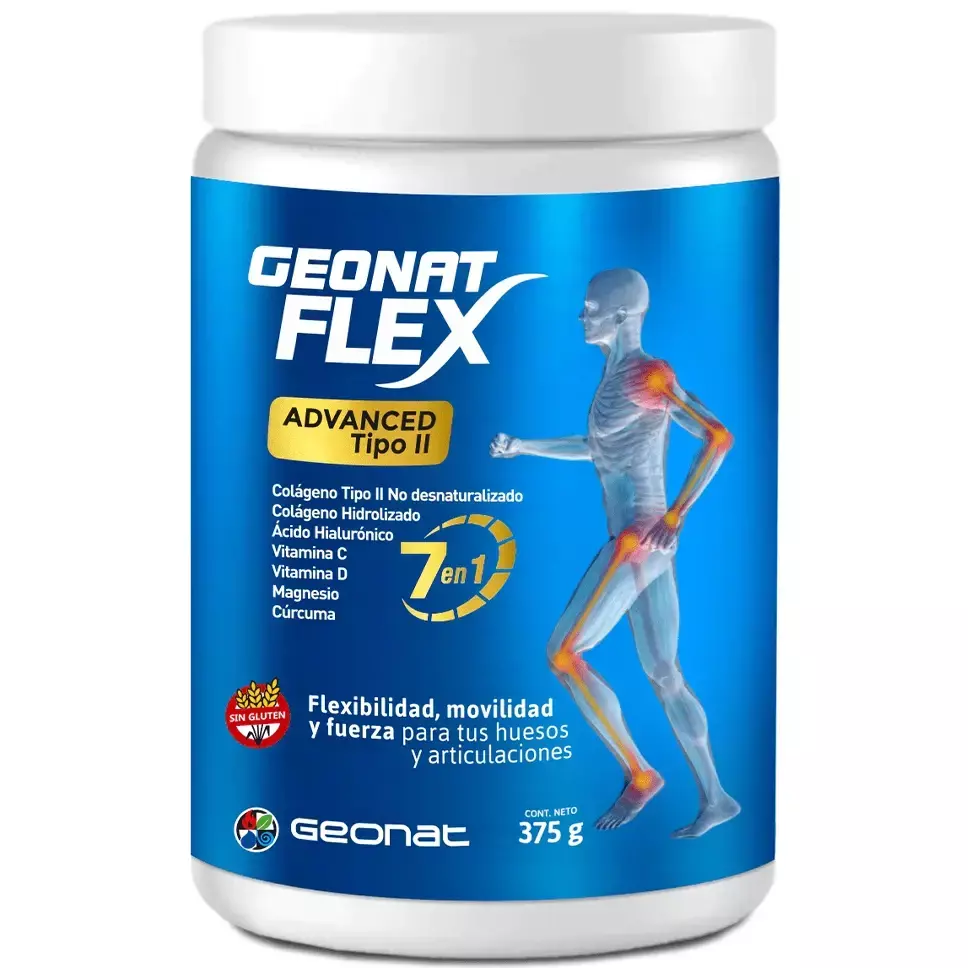 Geonat Flex Advanced TII es un suplemento en polvo que combina colágeno tipo II no desnaturalizado, colágeno hidrolizado, ácido hialurónico, magnesio, extracto de cúrcuma y vitaminas C y D. Este suplemento brinda apoyo integral a la salud articular, alivia el dolor y mejora la flexibilidad, ayudando a prevenir el desgaste articular y promover un bienestar general.
